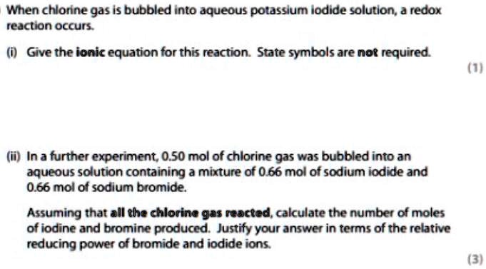 Solved When Chlorine Gas Is Bubbled Into Aqueous Potassium Lodide Solutlon Redox Reaclon Occurs Give The Ionic Equation For This Reaction State Symbols Are Nok Required Ji In A Further Experiment 0 50