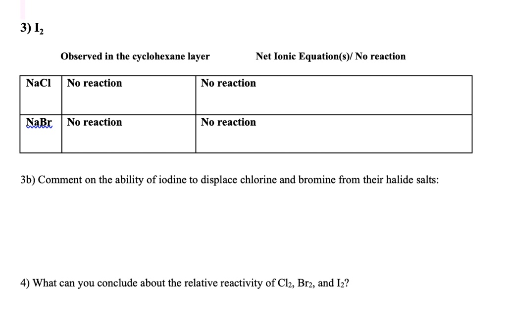 Solved 3 1 Observed In The Cyclohexane Layer Net Ionic Equation S No Reaction Naci No Reaction No Reaction Nabr No Reaction No Reaction 3b Comment On The Ability Of Iodine To Displace Chlorine